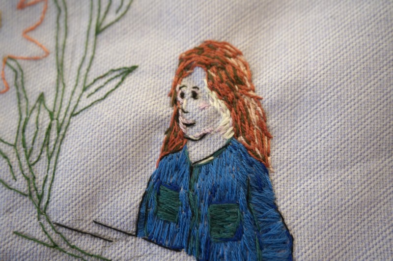 Les rencontres avec des femmes, pour parler d'autres femmes, s'y sont succédées. J'ai pu ensuite préparer ce qui est devenu les broderies, collages de cuir, dessins et montage son qui composent aujourd’hui l’installation.