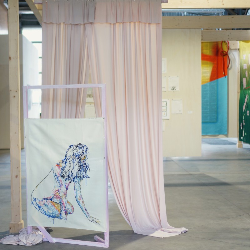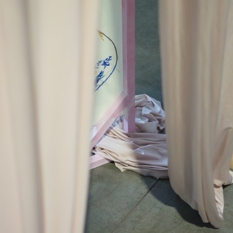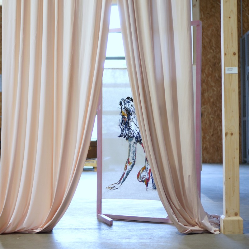 Selon la position du/de la visiteur.euse, un drapé révèle ou dissimule la broderie.