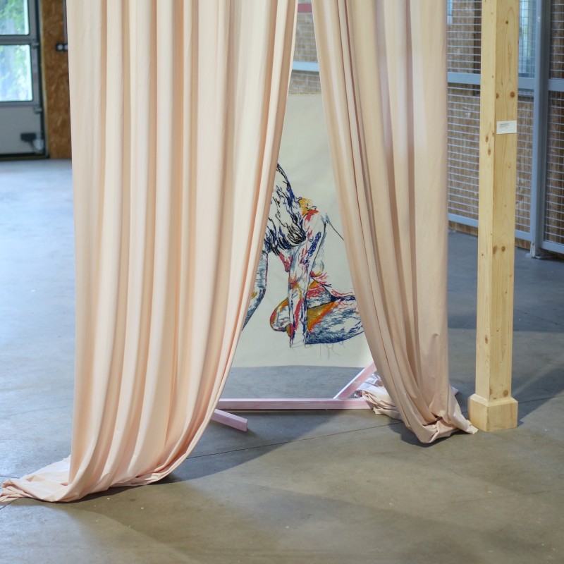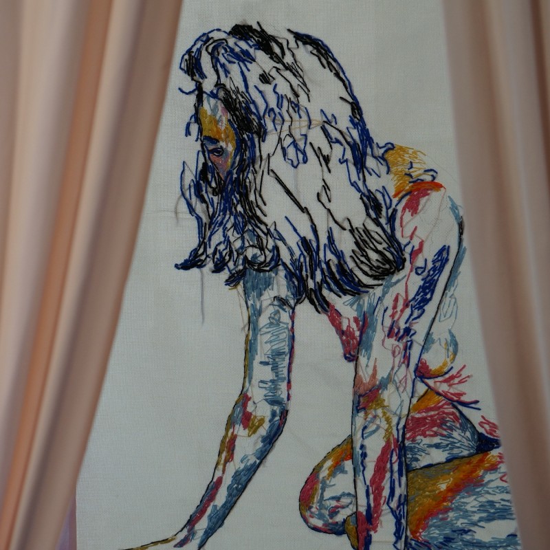 Fougères (Fabienne) is an embroidery in wool thread mounted on a stand. The execution line is quick to convey something of the energy of the body and skin. A muscled, veined body in bright colors but held at rest. The embroidery mounted on a stand allows observation of both sides of the work, with the reverse side adding a reading where the body becomes blurred under a maze of thread. Depending on the visitor's position, a drape reveals or conceals the embroidery.