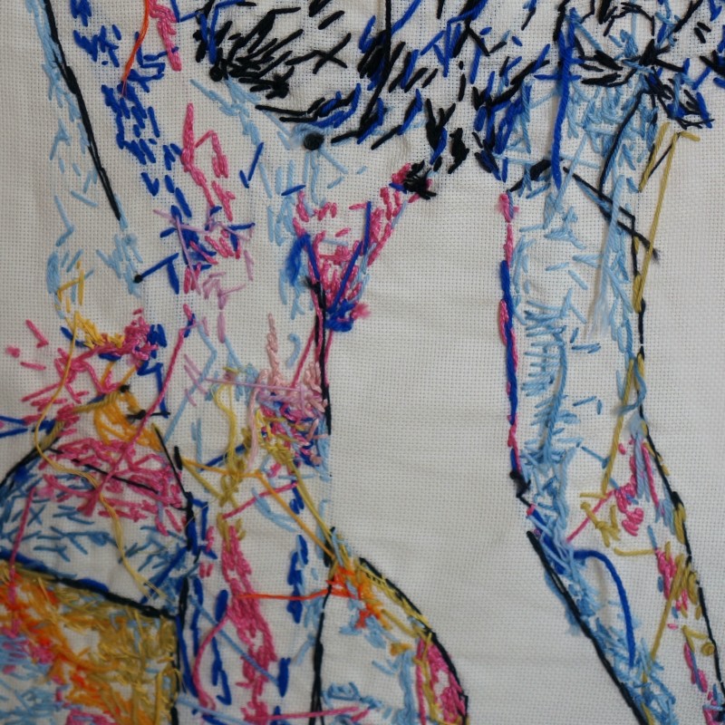 Fougères (Fabienne) est une broderie au fil de laine montée sur portant. Le trait d’exécution est rapide pour raconter quelque chose de l’énergie du corps et de la peau. Un corps musclé, veiné, aux couleurs vives mais qui se tient au repos. La broderie montée sur portant permet d’observer les deux faces du travail, le verso ajoutant une lecture où le corps se floute sous un dédale de fil.