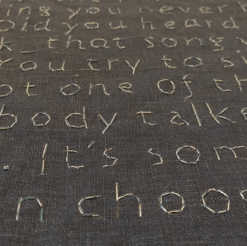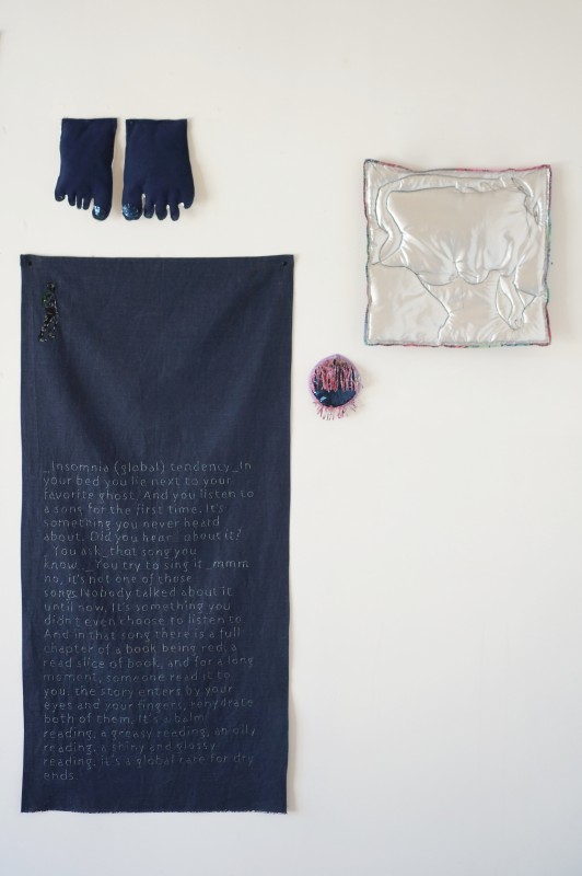 L’œuvre cherche à faire cohabiter des fantômes, des sensualités, des formes de lutte, travaillant par le lent travail du fil brodé les imaginaires insomniaques, valorisant le statut de cet état de non-repos.