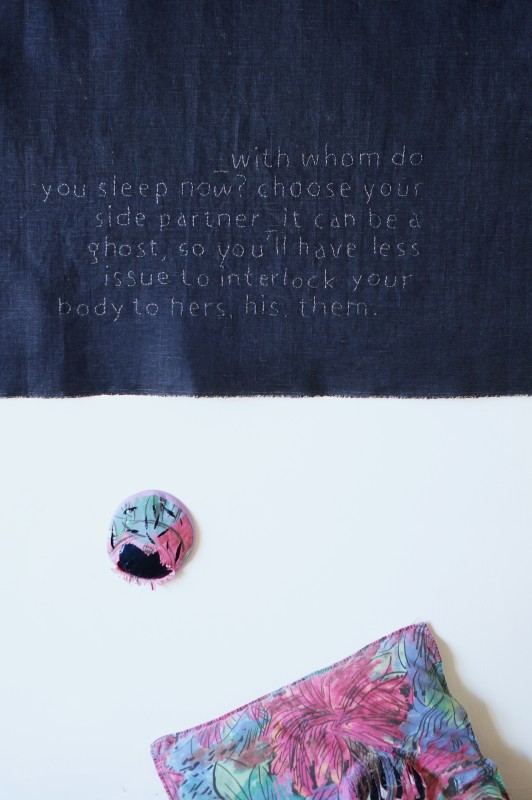 The work seeks to bring together ghosts, sensualities, forms of struggle, working through the slow labor of embroidered thread on insomniac imaginaries, valuing the status of this state of non-rest.