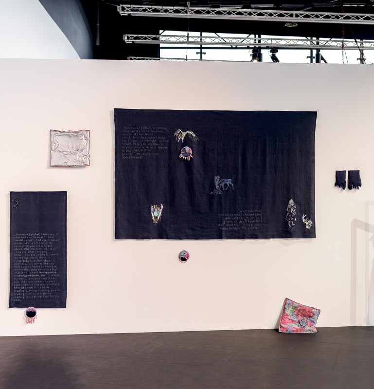 Sweet dreams (are made of this) est un ensemble textile composé de deux broderies (la grande insomnie & la petite insomnie) et d’un ensemble de pièces satellites (2 yeux, 2 pieds et 2 coussins).