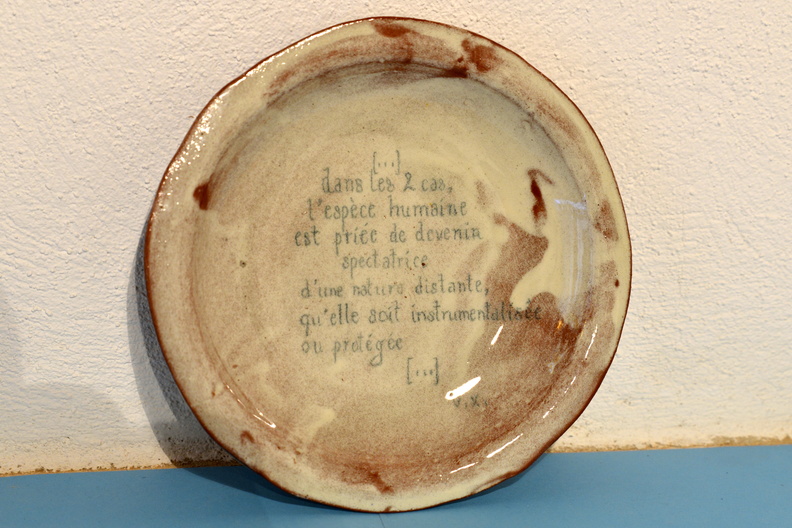 Je souhaitais travailler sur le caractère faillible et interchangeable de certaines frontières. Chaque assiette contient un bout de ligne en pointillé. Disposées ensemble, elles forment un e frontière plus ou moins grande selon le nombre d’assiettes reliées. Plusieurs configurations de frontières sont possibles.