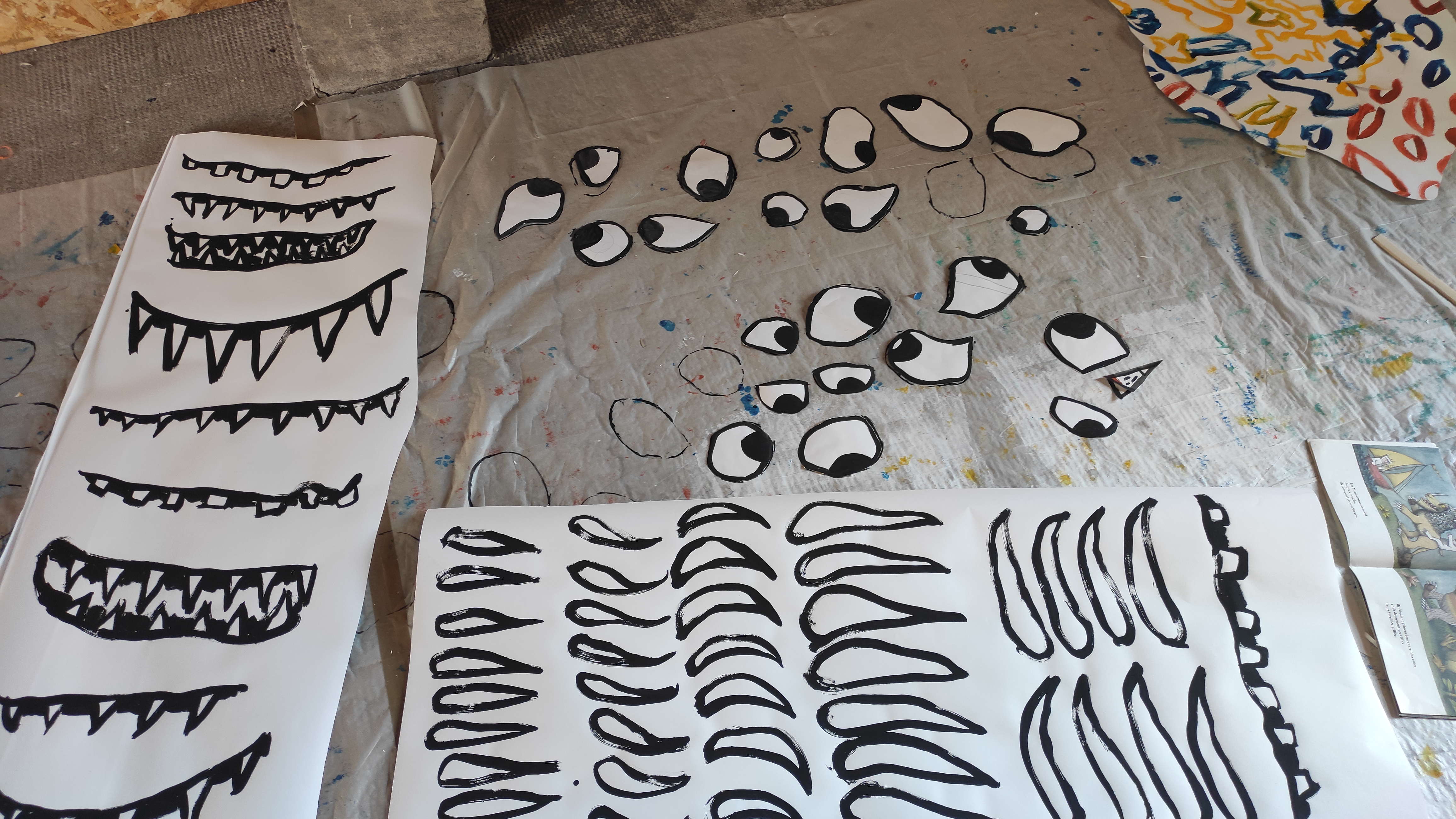 Puis nous avons découpé et donné forme à ces dessins à partir du catalogue de formes issues également du livre: de grands monstres en plusieurs parties, des masques de Max avec des grands yeux et des guirlandes de dents, des voiles de bateau, des pattes griffues.