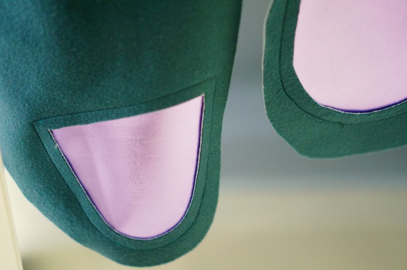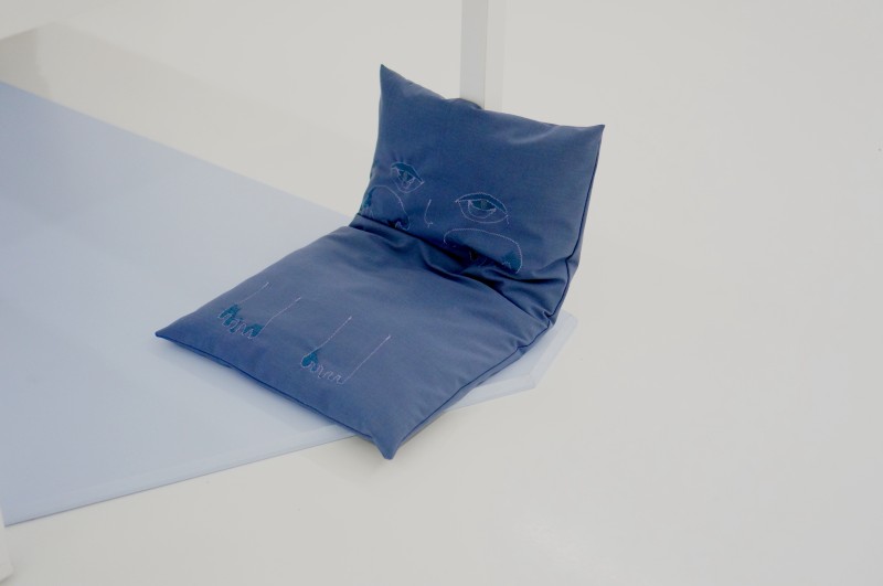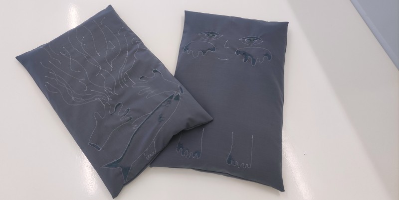 À l'étage du musée, le recouvrement d'une assise circulaire permet de cohabiter avec une montagne-fantôme en velours. Une cimaise s'habille d'un drapé sombre pour envelopper le dos des regardeur.euse.s. Deux coussins brodés-dessinées se sont endormis sous une table.