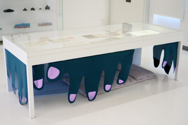 On the ground floor, hands—half-claws, half-gloves—form a hut where you can slip in to listen to the story of the three robbers told by Tomi Ungerer. Elsewhere, two table legs become soft for comfortable leaning.