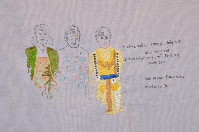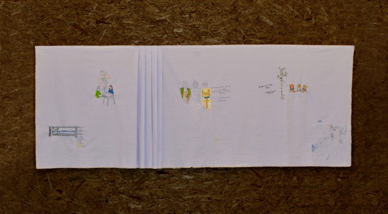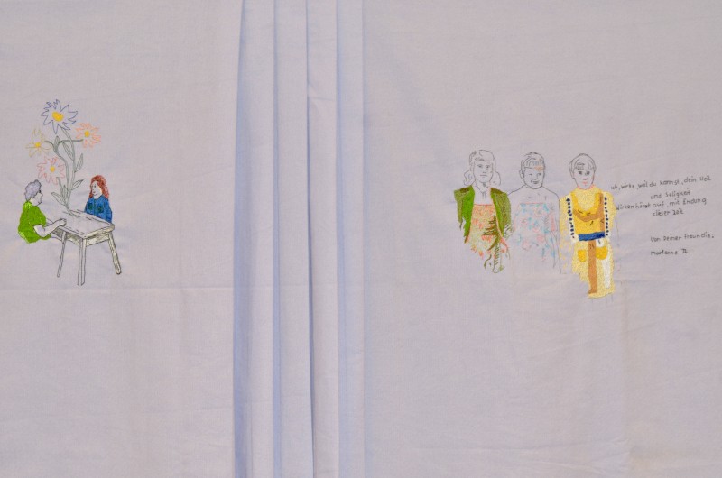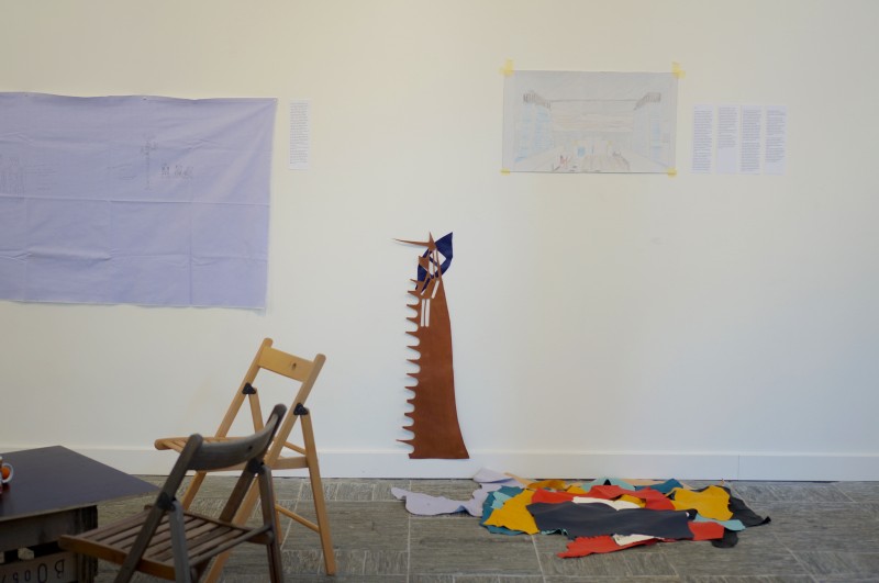 Les rencontres avec des femmes, pour parler d'autres femmes, s'y sont succédées. J'ai pu ensuite préparer ce qui est devenu les broderies, collages de cuir, dessins et montage son qui composent aujourd’hui l’installation.
