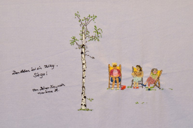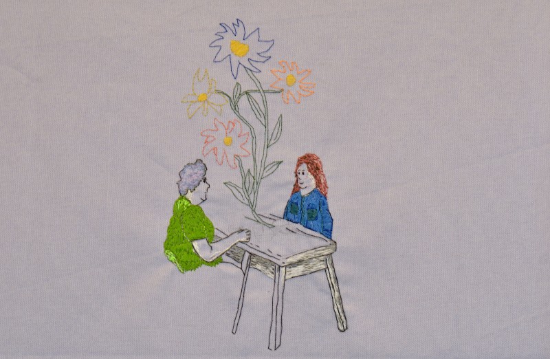 When Marianne A. tells me about her friends Marianne D. and Marianne H. whom she met in elementary school, she brings me a friendship book, which she likes to call her poetry notebook. I integrate into her object adaptations of messages and drawings directly taken from this notebook. At the end of the residency, Marianne A. allows me to exhibit a slideshow of photos taken from her friendship book.