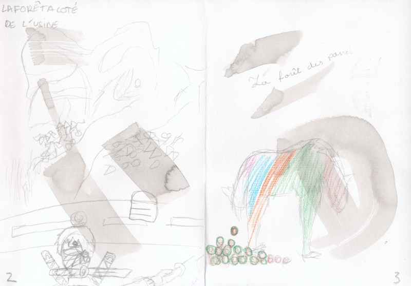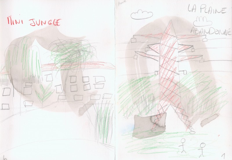 photos 13 à 21: dessins en temps limités accompagnés d'une proposition de nom pour chaque sites visités avec les jeunes artistes du CSC du port du Rhin : Tolga, Ziyadah, Ethan, Thomas, Roland, Zinedine, Angel, Amir, Irène, Emma et Benjamin ©Hyper-forêt