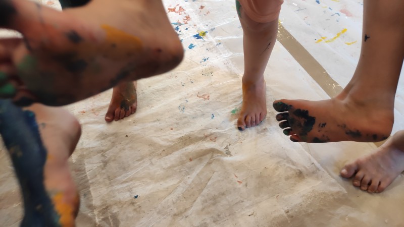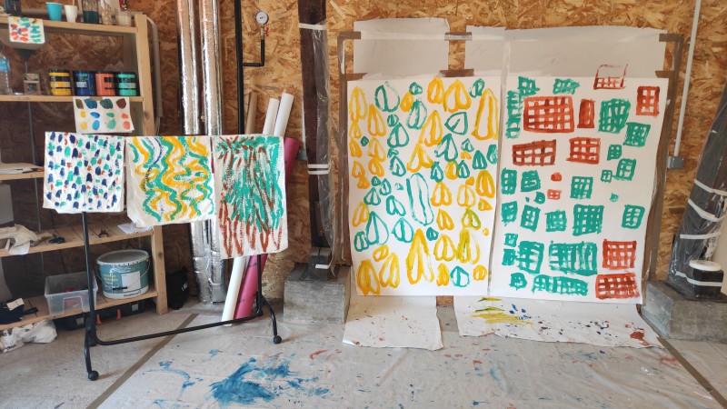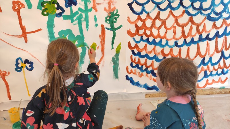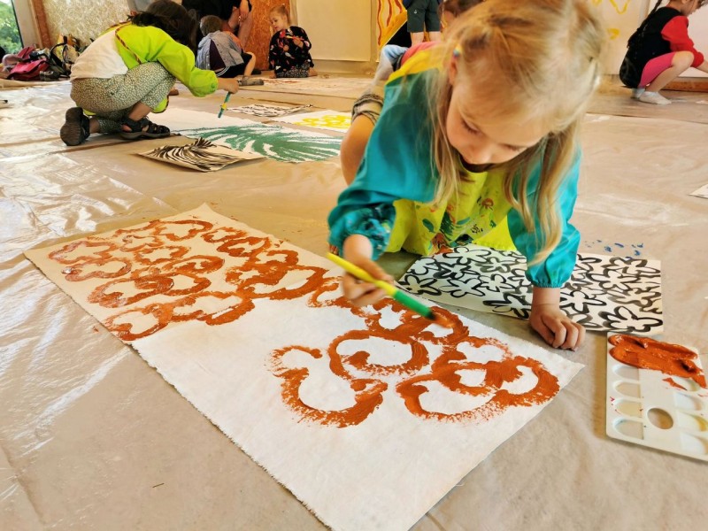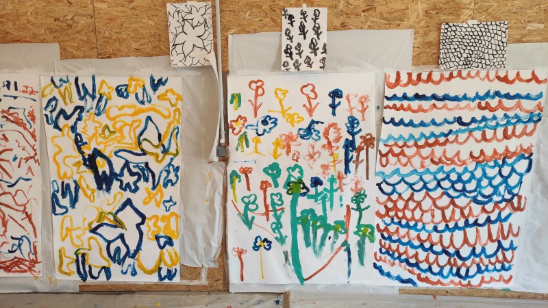 Nous avons travaillé la peinture acrylique sur papier et tissu. Les enfants ont peint en remplissant toute la surface de la page à partir des motifs que nous avions au préalable observé et qui composent les dessins du livre (écailles, poils, vagues, étoiles, feuillages etc...)