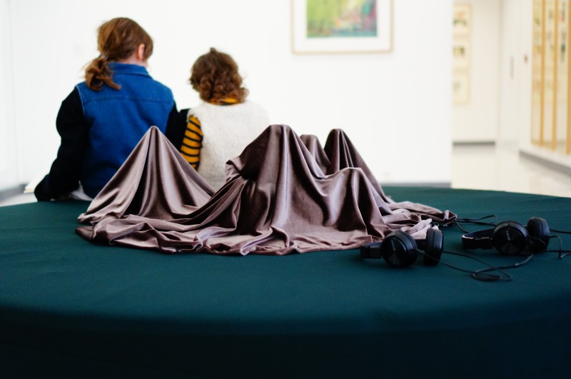 On the museum's upper floor, the covering of a circular seat allows cohabitation with a ghost-mountain in velvet. A display rail is dressed in dark drapery to envelop the backs of viewers. Two embroidered-drawn cushions have fallen asleep under a table.