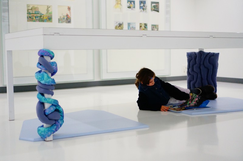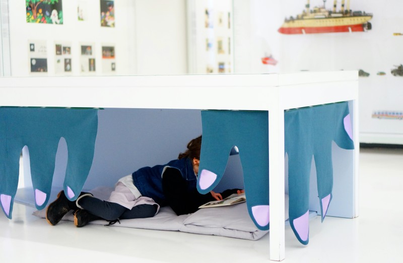 On the ground floor, hands—half-claws, half-gloves—form a hut where you can slip in to listen to the story of the three robbers told by Tomi Ungerer. Elsewhere, two table legs become soft for comfortable leaning.