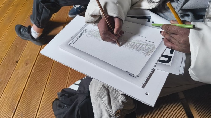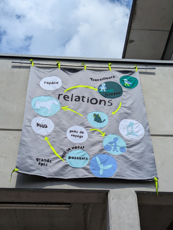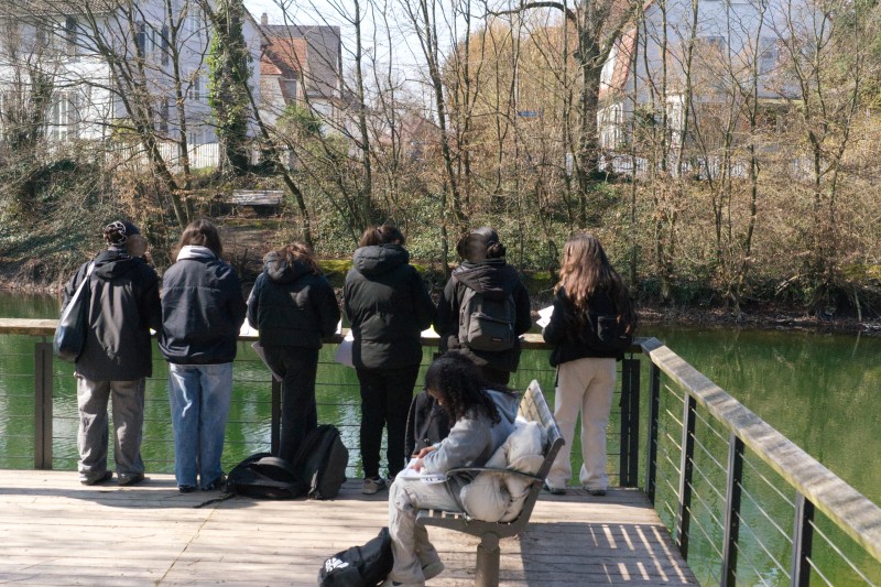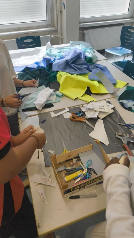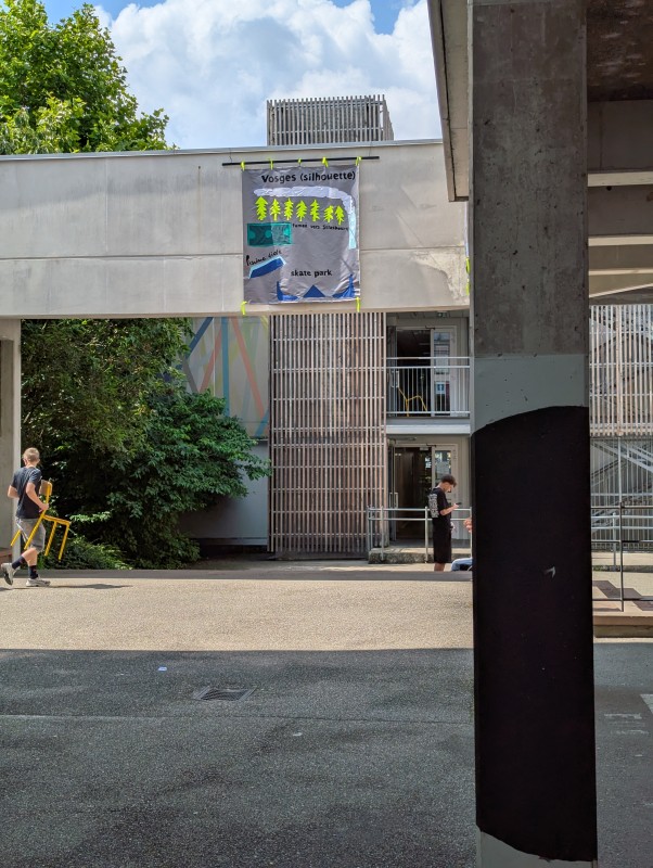 Entre mars et juin 2025, les élèves de 4eB ont pu arpenter, décrire, dessiner et raconter un arpentage dans les espaces verts de Kehl et du jardin des deux Rives. Plusieurs rencontres ont eu lieu mêlant écriture poétique, dessin et travail du tissu pour aboutir à deux créations : un podcast et cinq bannières en tissu suspendues dans l’enceinte du collège.